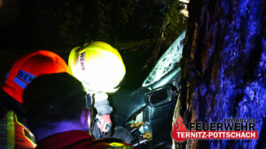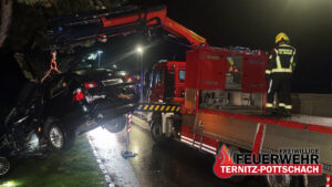 Nach der erfolgreichen Rettung und Übergabe des Fahrers an den Samariterbund begann die Feuerwehr gemeinsam mit der Feuerwehr St. Johann mit der Bergung des Unfallfahrzeuges. Die Kameradinnen und Kameraden der FF St. Johann verbrachten den PKW anschließend an einen sicheren Abstellort.