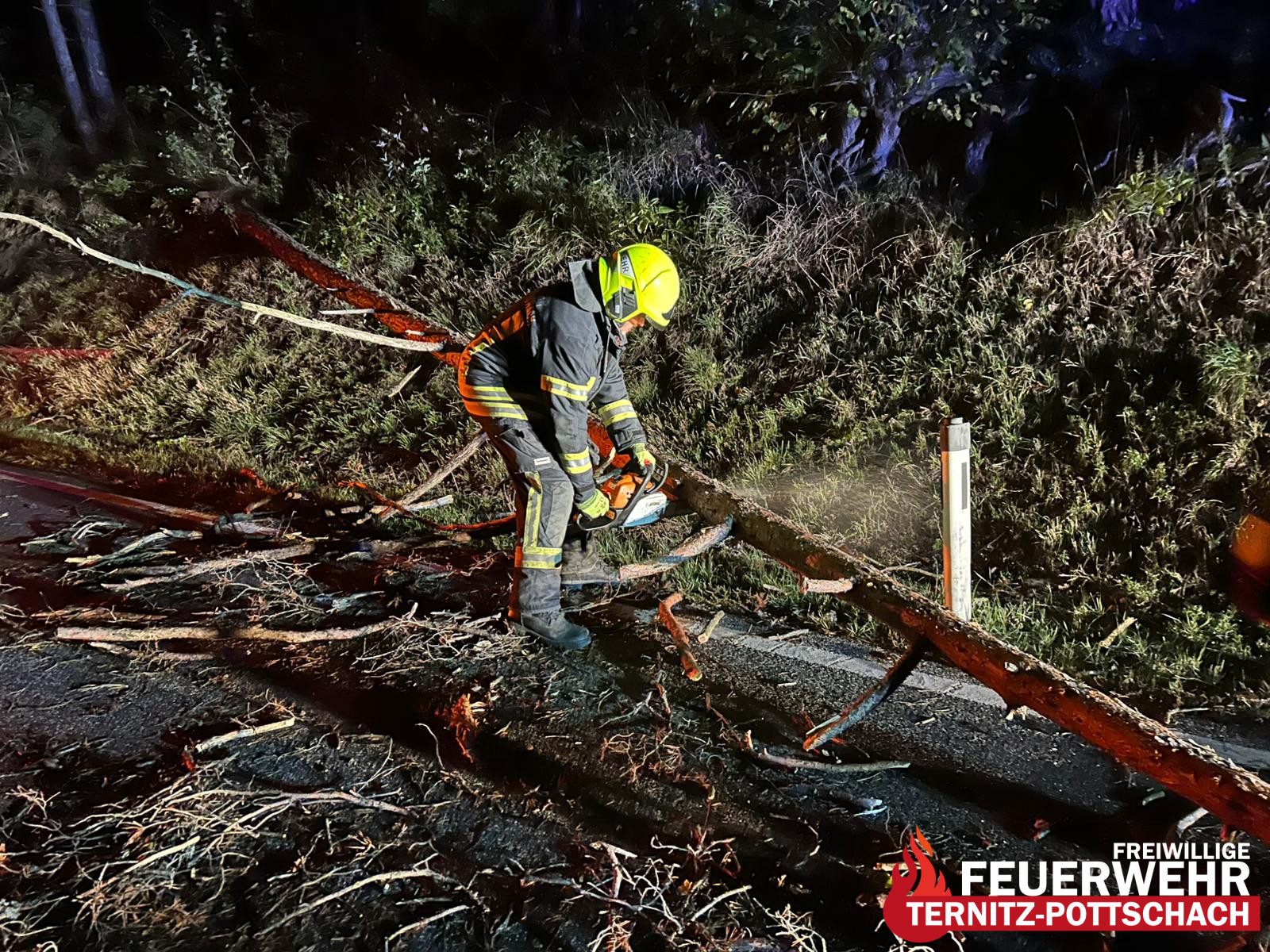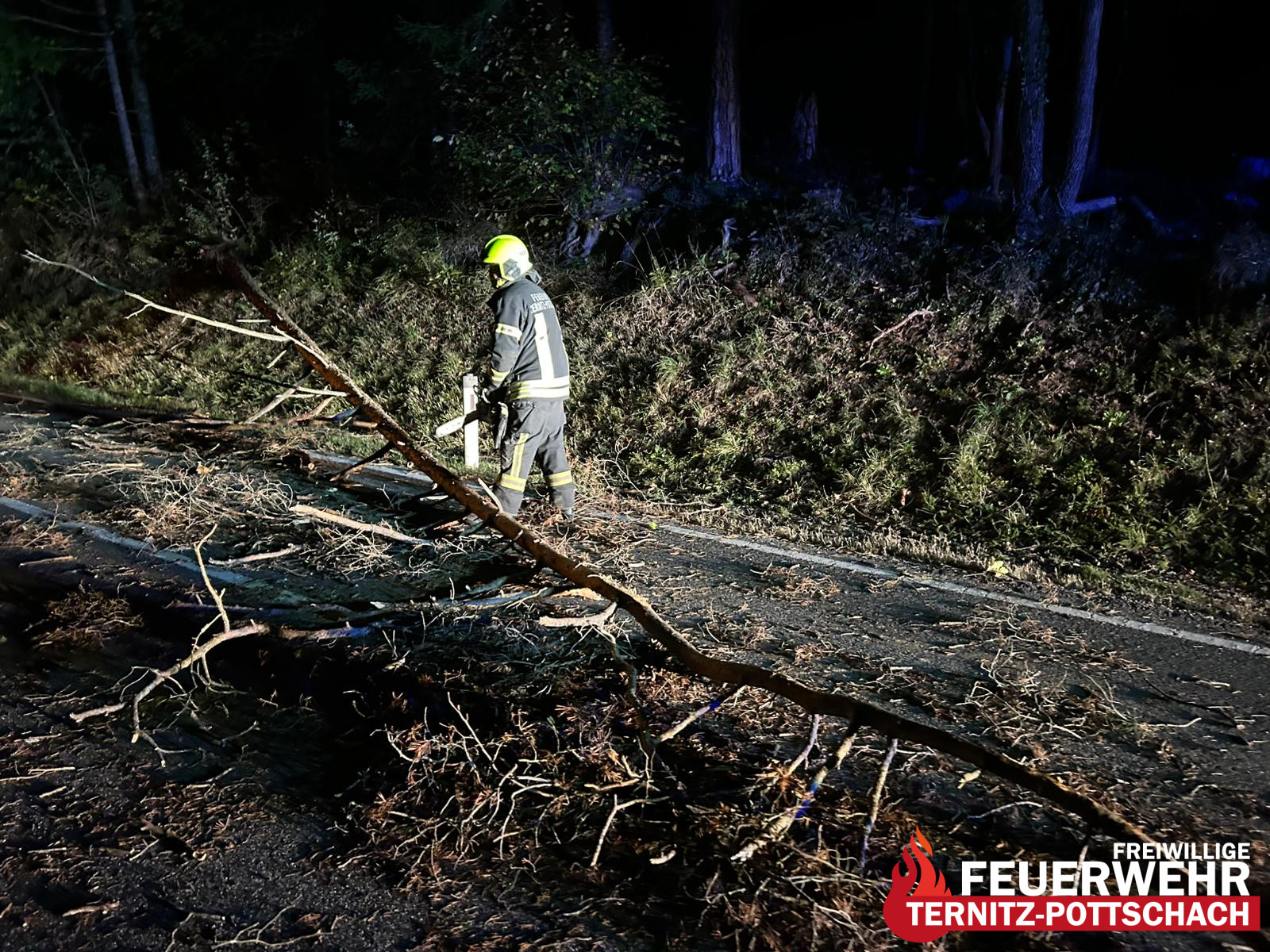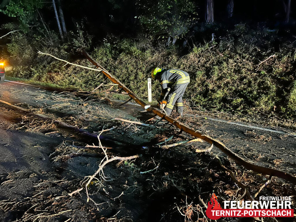 In den frühen Morgenstunden des [aktuellen Datums einsetzen] wurde die Feuerwehr Ternitz-Pottschach um 01:56 Uhr zu einem technischen Einsatz (T1 – Baum auf Straße) nach Ternitz-Vöstenhof alarmiert. Ein umgestürzter Baum blockierte die Fahrbahn.