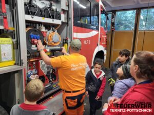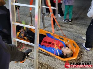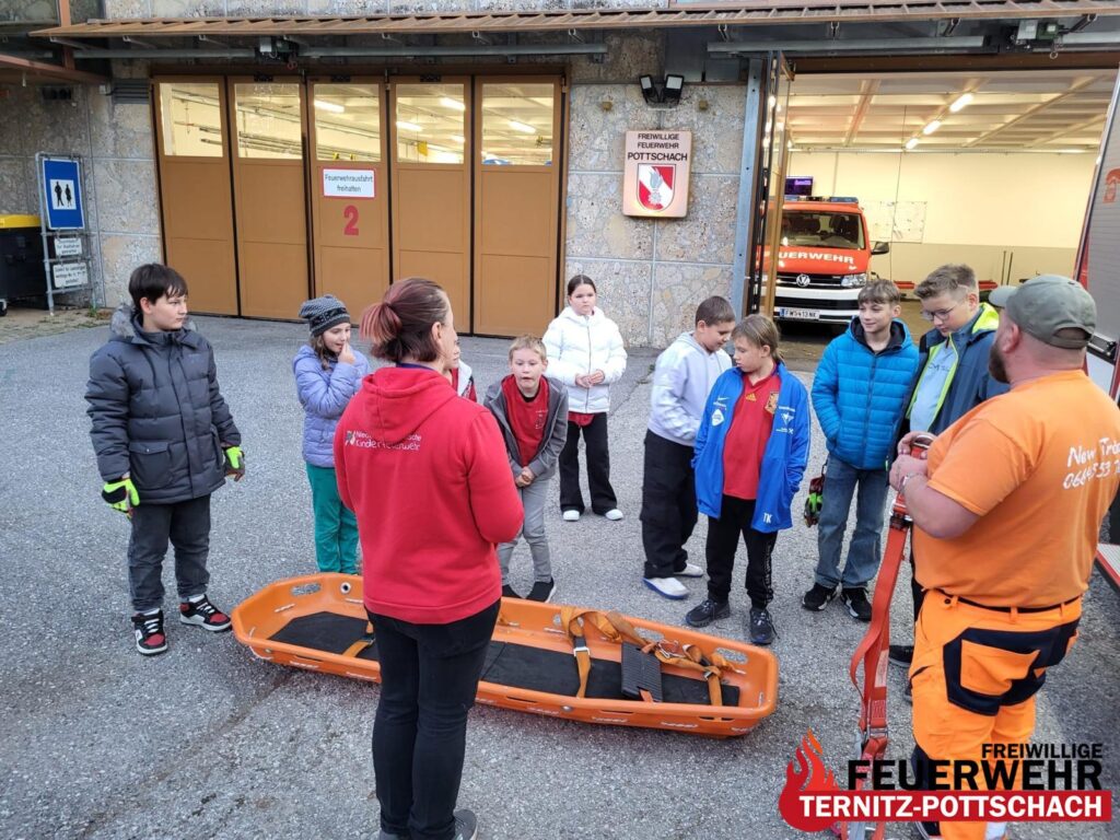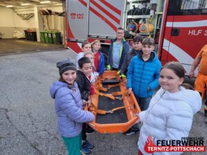 Nach einer spannenden Einführung in die Fahrzeugkunde, bei der es auch ein kleines Quiz gab, folgte eine praktische Übung mit der Rettungstrage. Dabei galt es, gemeinsam eine „verletzte Person“ zu bergen – Teamarbeit, Geschick und Spaß standen dabei im Mittelpunkt.