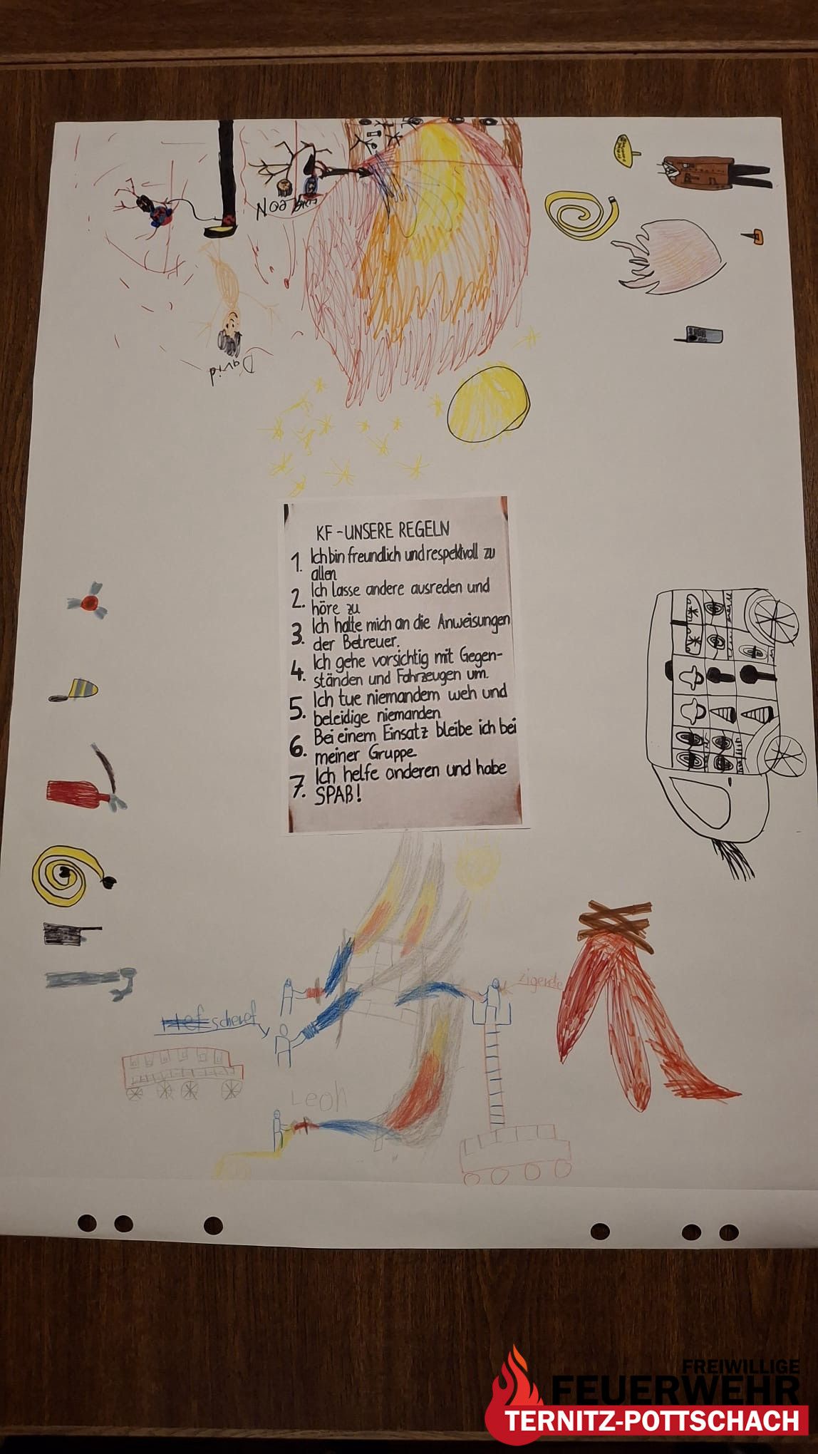 Gemeinsam erarbeiteten die Kinder jene Regeln, die im Feuerwehrhaus, bei Übungen und im Umgang miteinander gelten. Anschließend wurden diese Regeln in liebevoller Detailarbeit kreativ gestaltet und mit Zeichnungen verschönert.