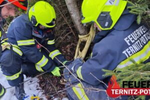 Die Feuerwehr Ternitz-Pottschach sicherte das Fahrzeug zunächst gegen weiteres Abrutschen. Im Anschluss wurde der PKW mittels Seilwinde des HLF 3 aus seiner misslichen Lage befreit.