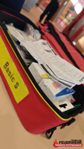 Im Rahmen der Schulung wurden die Erste-Hilfe-Taschen der Feuerwehr durchgenommen. Dabei konnten verschiedene Methoden und Verbandsmaterialien praktisch angewendet und geübt werden.